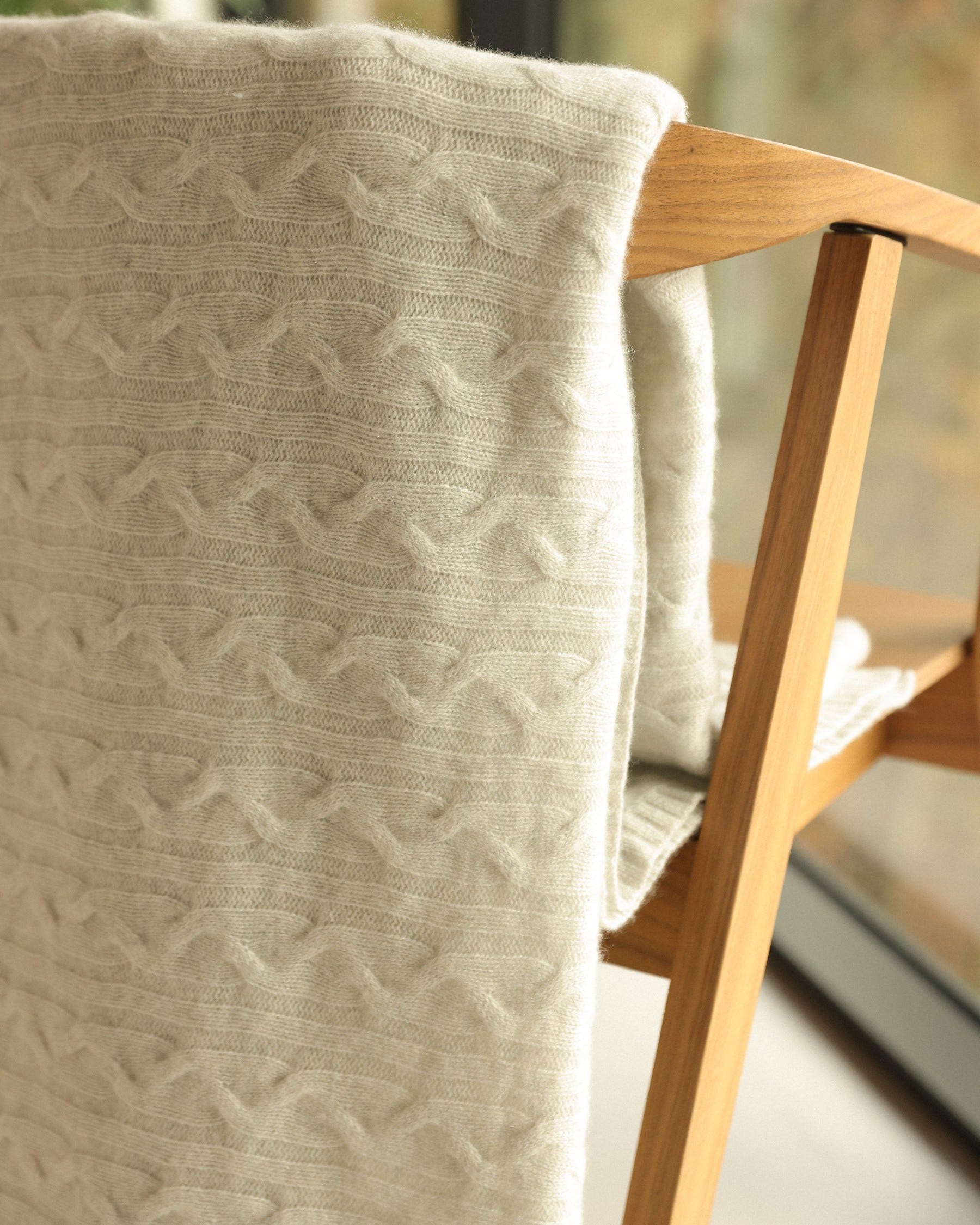 Wrap yourself in pure luxury with the Cozy Cable Throw, crafted from 100% super fine Inner Mongolian cashmere. Featuring an elegant cable rope knit stitch, this timeless piece adds warmth, texture, and sophistication to any space. Perfect for cozy evenings or as a stunning housewarming gift.