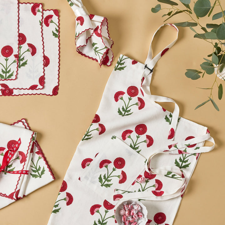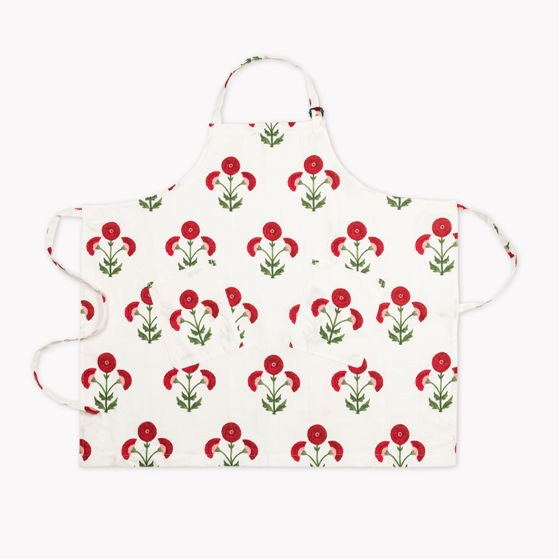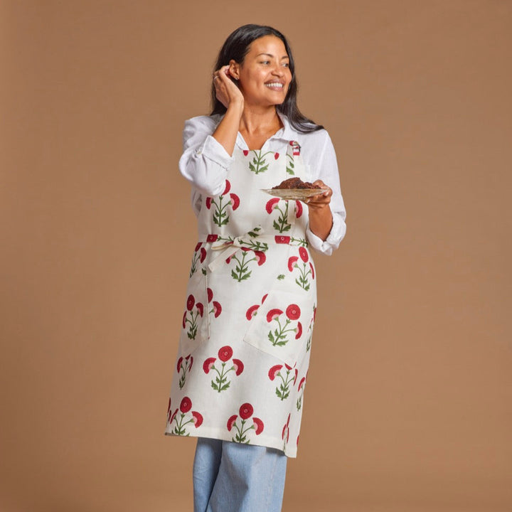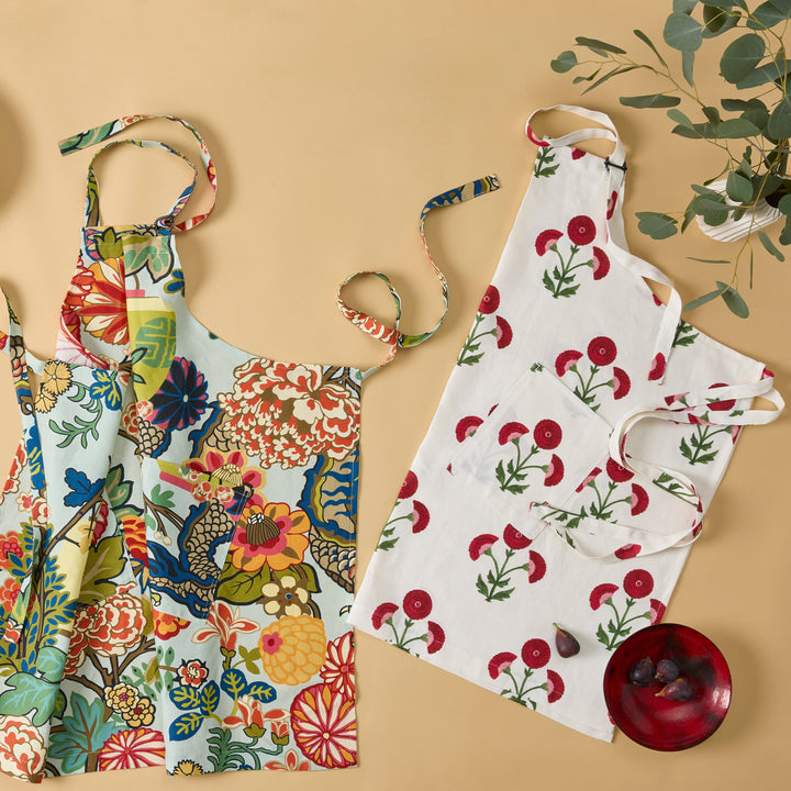 Experience the perfect blend of style and functionality with our Signature Schumacher Printed Linen Apron. Made from 100% linen, this apron is designed for a chic kitchen look, featuring an original Schumacher print with scarlet-hued blooming bouquets that add a whimsical touch to your cooking routine.