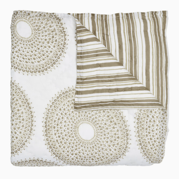 Give your bed a bohemian twist with this soft-as-a-cloud cotton voile quilt. Featuring a reversible design with coordinating stripes on the back, it offers effortless style and lightweight comfort for any season. Hand-stitched for a beautifully textured look, this quilt is an artisanal masterpiece.