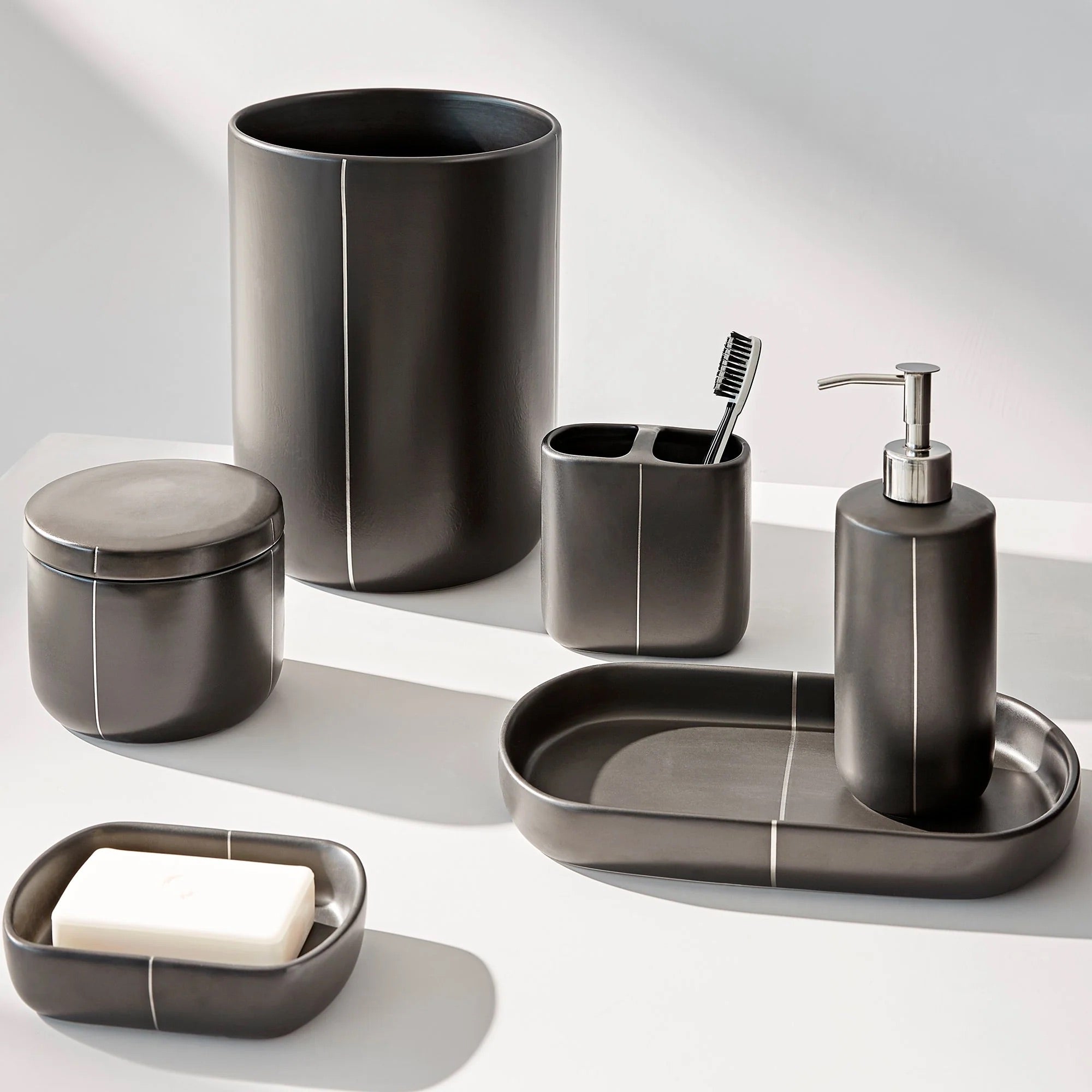 Crafted from stoneware and detailed with a hand-painted line, the Nero Bath Accessories bring modern sophistication to your bathroom. These elegant pieces blend seamlessly into contemporary spaces, offering both style and function.